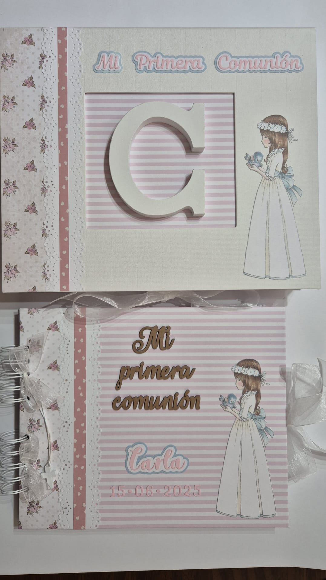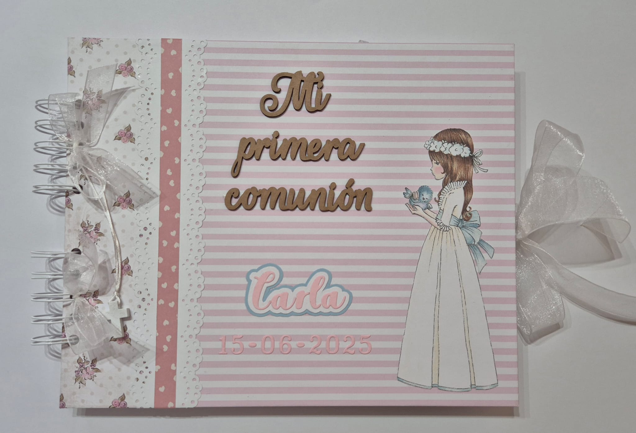 El libro puede ser personalizado con el nombre de la niña, la fecha de la comunión y otros detalles especiales.