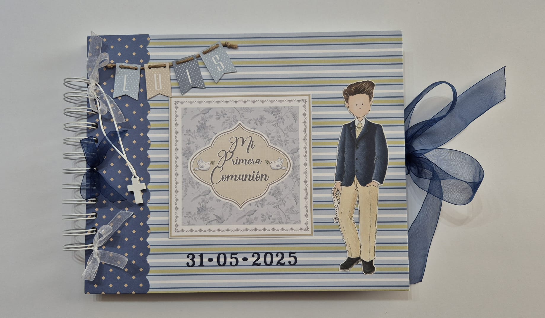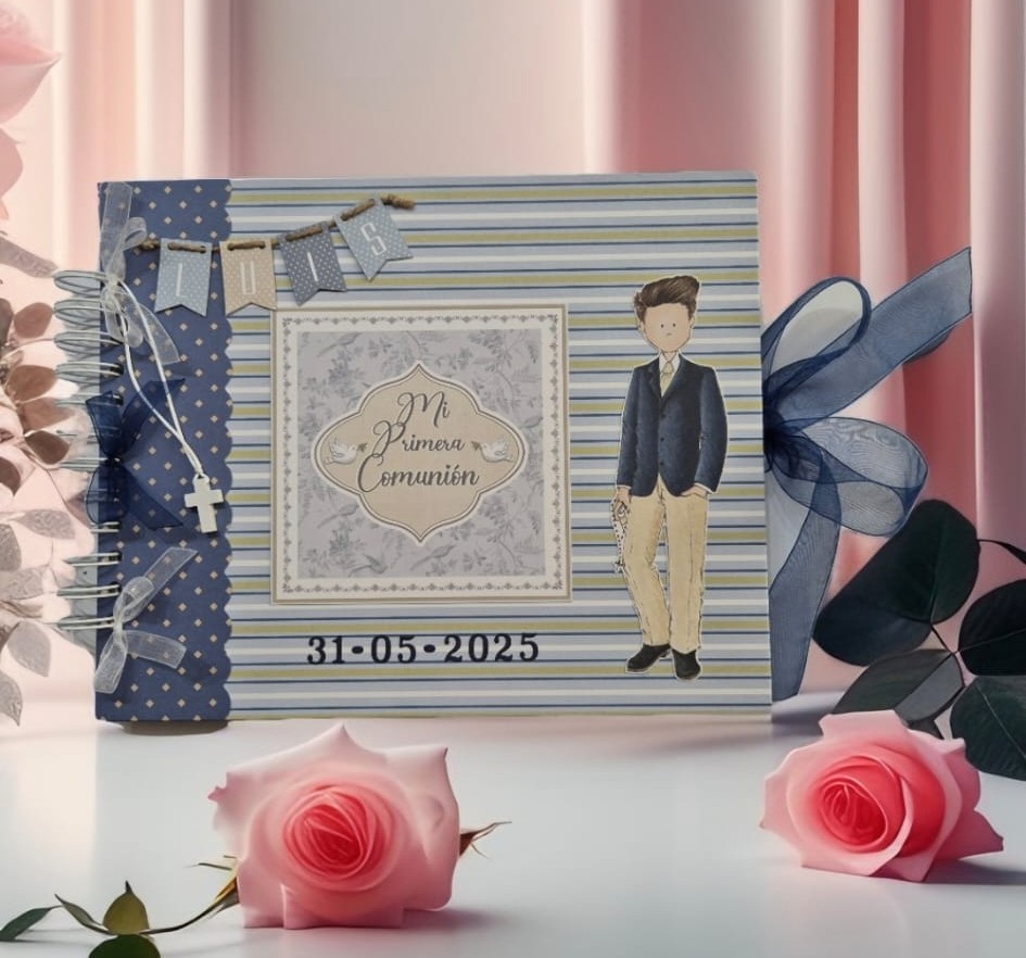 El libro puede personalizarse con el nombre del niño, la fecha de la comunión y detalles que reflejen su personalidad o tema elegido.